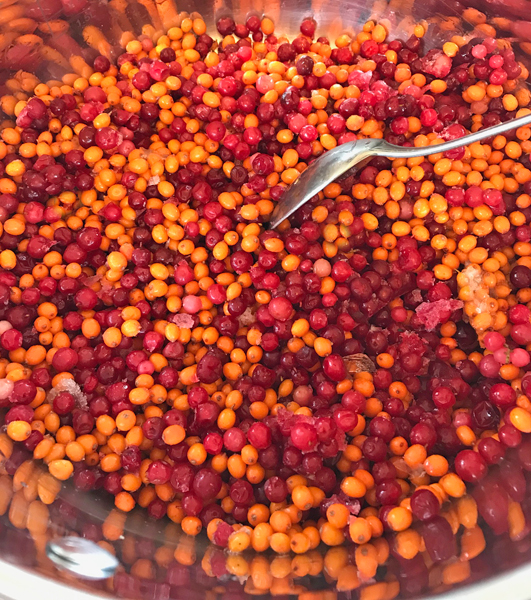I used equal quantities of Lingonberries and Seaberries, added just a little bit of water and bring them to a boil until they got soft.