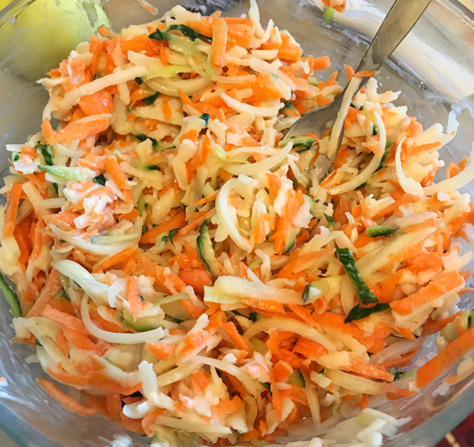 Am dat totul pe razatoare, mai putin ceapa pe care am taiat-o pestisori. Am asezonat cu sare, piper, ulei si otet.