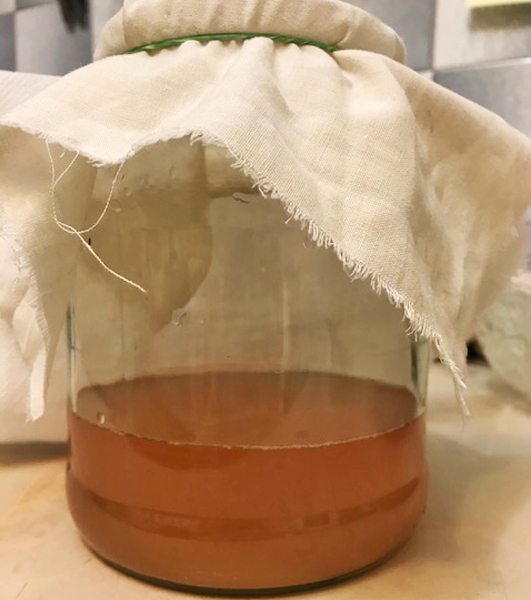 La urmatoarea tura putem scoate “mama” si sa o adaugam dupa prima faza, cand strecuram lichidul de pe coji, astfel otetul va fi gata mai repede.
