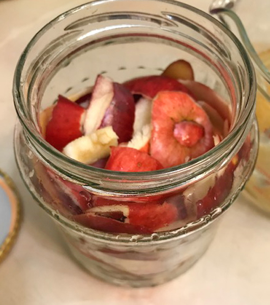 Se aduna intr-un borcan, de preferat tinut la frigider, coji de mere curate – netratate si eventual cotoare, eu am adunat doar coji, pana se umple borcanul.
