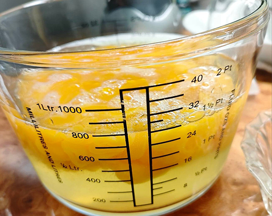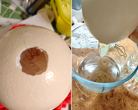 Am scuturat de praf gaura, am rupt pielita si am turnat oul intr-un vas, iese destul de usor, scuturat cate putin pana curge tot continutul.