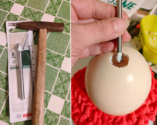 Apoi folosind un burghiu pentru ceramica am facut usor o gaura mica pana am ajuns la pielita, pe urma usurel cu un ciocan si burghiul pe post de dalta am mers roata si am largit gaura.