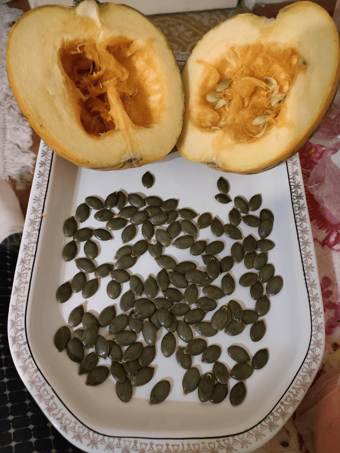 Anul asta am pus cateva fire de dovleac cu seminte fara coaja, soiul acela folosit special pentru obtinerea uleiului deoarece semintele fiind fara coaja lemnoasa sunt mult mai usor de procesat. Nu, nu am vrut sa obtin ulei, doar sa am ceva de rontait 🙂