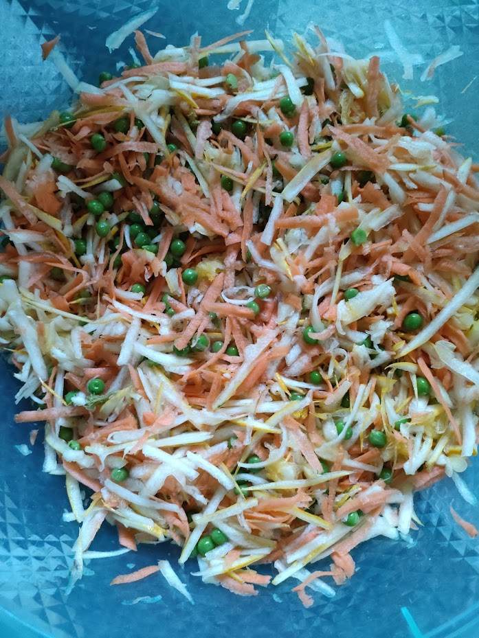 Combinat cu niste morcov razalit si ceva mazare, devine o gustare hranitoare si plina de vitamine pentru pasarile mele.