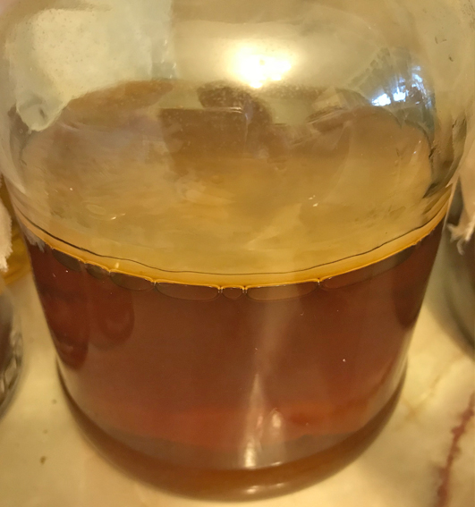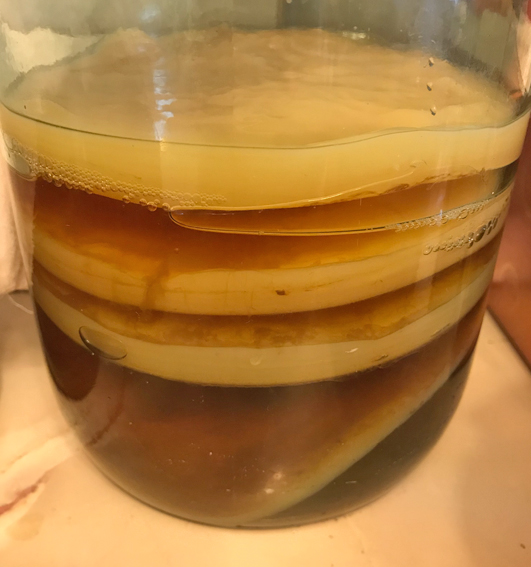Am primit doua SCOBY (Symbiotic Culture Of Bacteria and Yeast) de Kombucha acum vreo doua saptamani. Le-am dus acasa, le-am facut ceai negru indulcit cu zahar si le-am cazat frumos cate una intr-un borcan cu 2 L de ceai.