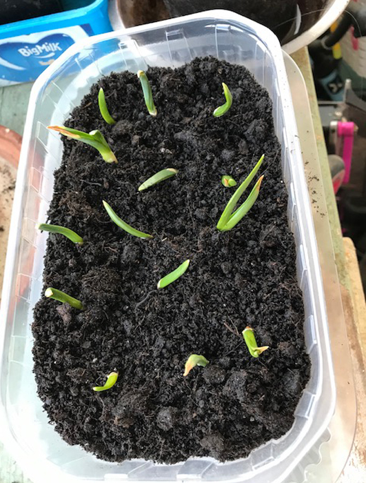 Asa ca in primavara m-am apucat de construit. Am reusit sa incep un strat in capat in care am semanat verdeturi. Desi l-am umplut cu pamant si compost cernut care a trecut mai intai de serviciul de deparazitare asigurat de gainutele mele, de undeva au aparut nesuferitii limacsi, probabil erau deja in solul de sub solar si au urcat in strat.